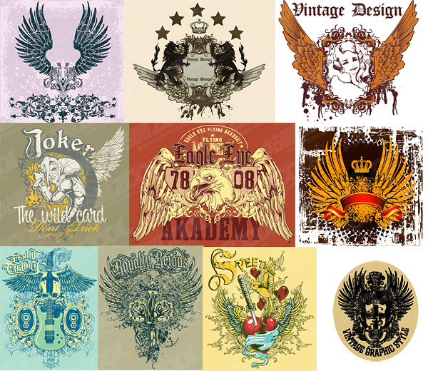 eps format, with jpg preview, the crucial words: vector design trend, back, wings, European-style design, printing clothing design, pattern, the lion, poker patterns, eagles, guitar, the crown, ribbon, ribbon, flowers, heart-shaped Women design, material vector